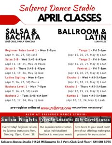 Join us this Friday at Salseros Dance Studio! Every Friday, we host the hottest Salsa party in Eugene, for all ages! Eugene's new Salsa Band, Descarga 54 will be playing great Salsa music, and in the breaks, DJ Jose Cruz will play Bachata, Merengue, & Cha cha cha. A Salsa and Bachata class for beginners is taught by Salseros Dance Company Instructors at the beginning of the evening. No experience or partner is necessary. Doors open at 8:45pm, class begins…