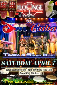 Live salsa and timba! Son de Cuba plays the Lounge on Saturday, April 7! Cover is $15. 21 & Over. Dance lessons from 9-10pm, live music from 10:30pm to 2am.